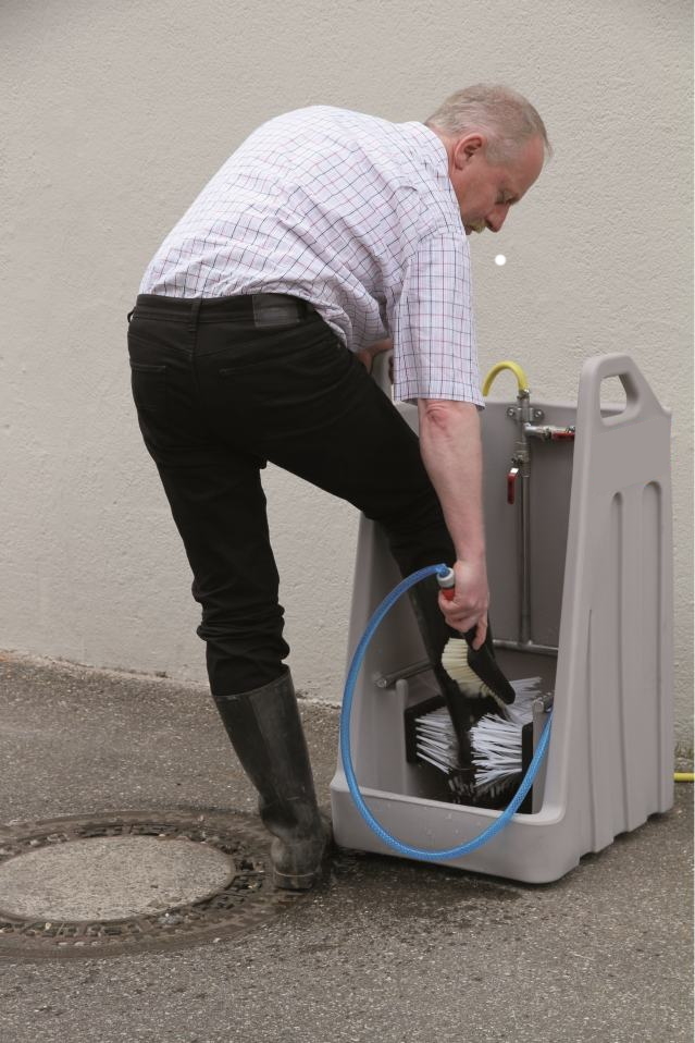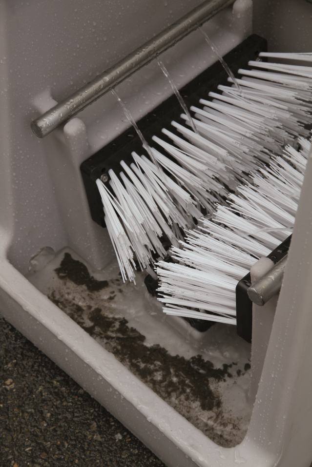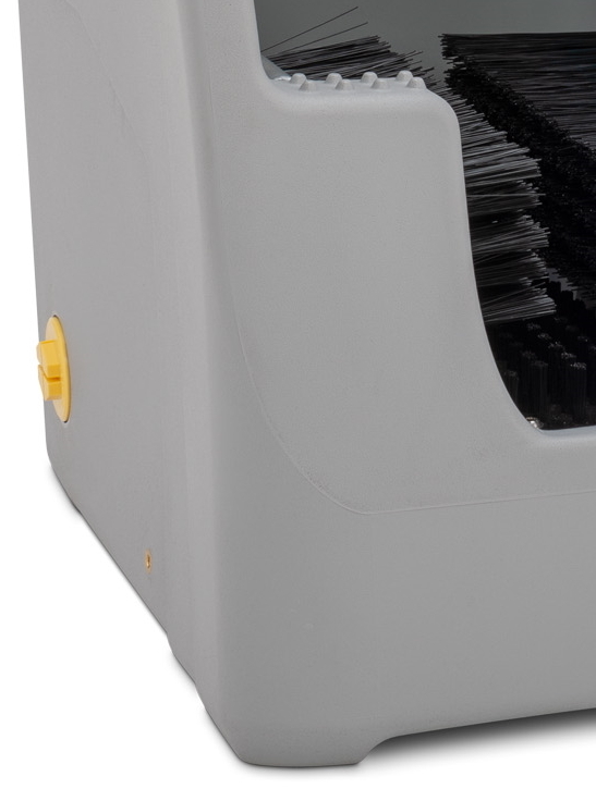 Cleaning the soles of safety shoes or boots is simple. Just turn the 1st ball valve to allow water to spray out towards the base. Combine this with the bottom and side brushes and you have the perfect handsfree wet clean. The addition of the water feed hand brush provides an additional cleaning mechanism. Simply turn on the 2nd ball value and you have full control to clean not only the soles but the sides of the boots. The wastewater is captured and channelled away towards 40mm PVC Ports, positoned at bottom rear on each side which can be plumbed to waste, minimising cross contamination and keeping the area clean.